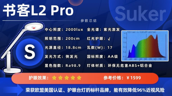为了提供更贴合青少年用眼需求和舒适的照明体验,SUKER书客也是大下功夫,全面优于国AA标准,显色指数实测接近满分的Ra98.9,以及具备较上代提升146%耐用性能的PLP光电处理器,光源更稳定,符合RG0无蓝光危害和无可视频闪。还具备自由调整高度到80cm、支持45min定时模式、自动开关灯等多种功能,满足不同的用眼需求。难怪有知名数码媒体给出了非常高的评价:被誉为旗舰护眼台灯的巅峰之作。