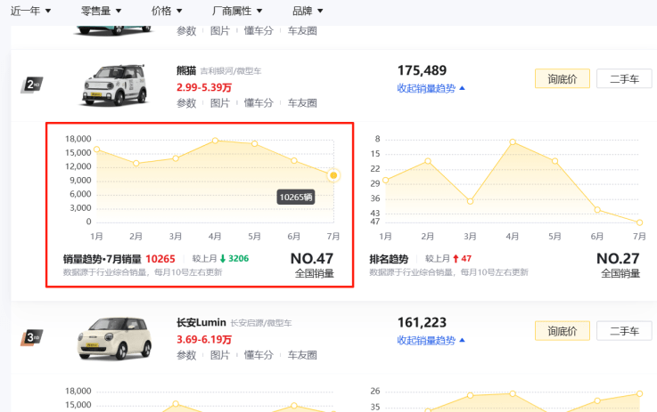 而值得一提的是,自今年5月份开始,吉利熊猫的月销量便一直处于下滑趋势,从5月份月销17,155辆下滑到7月份的月销10,265辆。考虑到吉利熊猫低配就有210km纯电续航的配置优势,真的很难让人相信,其销量也会走上下坡路。那么反观长安Lumin,这款车的续航也是210km,即便终端有2000元的置换补贴,起步价也偏高了些,达到4.29万元,这不禁让人疑惑,长安Lumin是怎么做到逆势上涨的?
