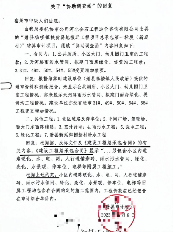 2022年12月,萧县法院判决镇政府支付工程款、工期损失等。镇政府不服上诉。2023年6月,宿州中院依据二审期间向审计部门获取的“回复函”,改判镇政府支付未审计及新增工程款1539万余元,维持一审其他判项。