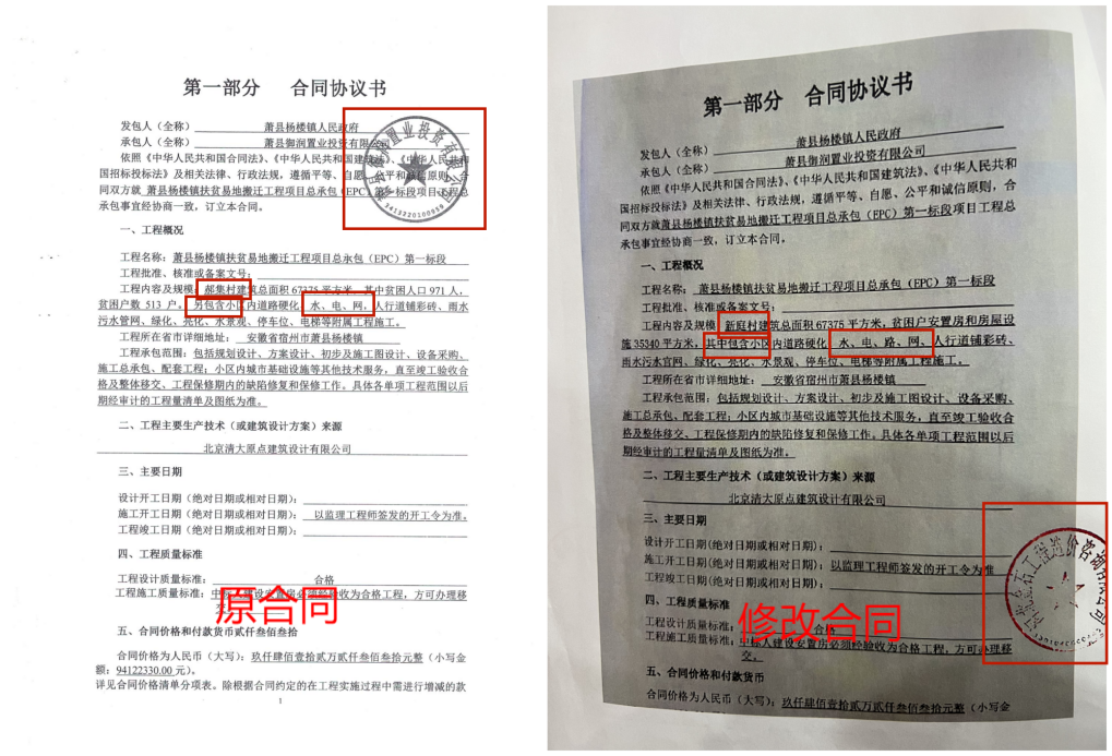 镇政府提交合同与企业方合同存在偏差:原合同中“郝集村”修改为“新庭村”,“另包含”改为“其中包含”,在原合同无“路”字的条款中添加,且原合同由御某公司盖章,镇政府提供的合同却加盖河北某造价咨询公司印章,多处关键内容与原件不符。