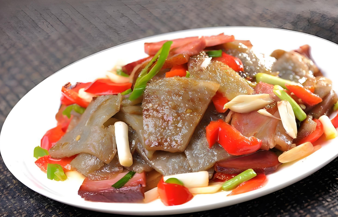 洋芋粑粑炒腊肉,腊肉肥而不腻,洋芋粑粑滑润爽口,美味难挡。