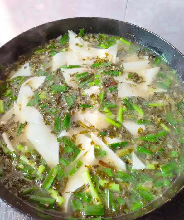 安康浆水面,时令青菜腌制浆水,搭配手擀细面,蒜辣子红油调味,清酸爽口,醒酒解晕。