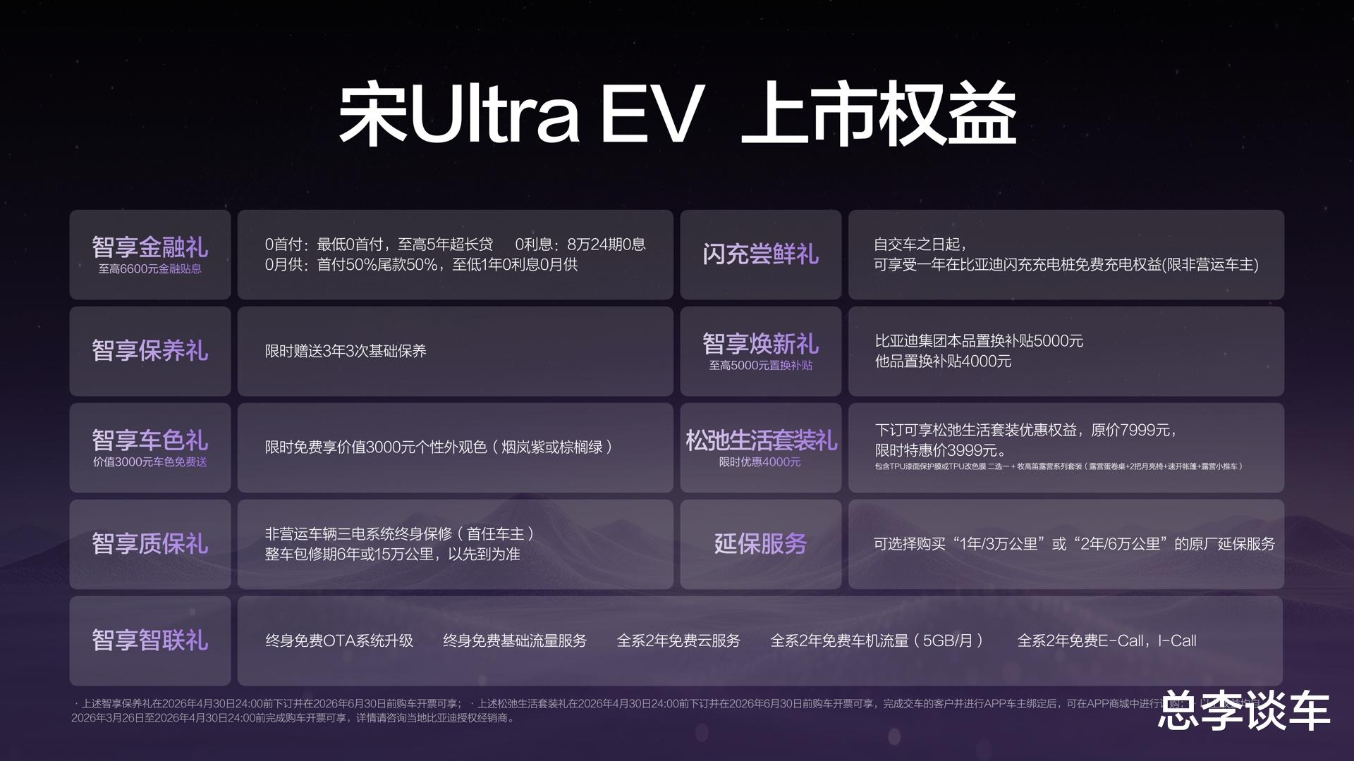 宋Ultra EV全系标配超100项实用配置,包括第二代刀片电池及闪充技术、主副驾座椅记忆、带遮阳帘的全景天幕、电动后尾门、15.6寸大屏、前备箱电动解锁、前排远端气囊、螺纹接口等,入门即满配,绝对是2026年最值得入手的SUV。