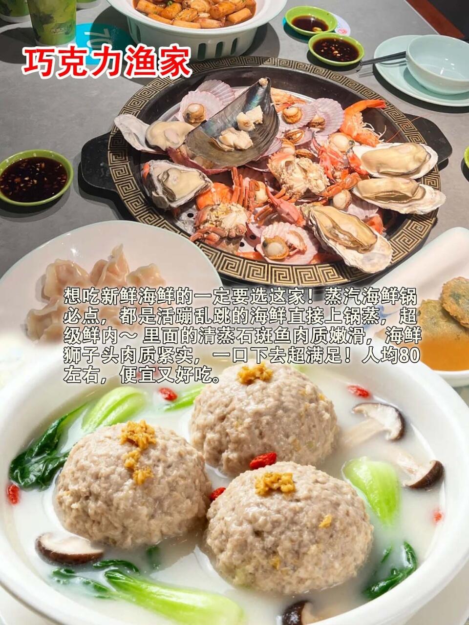 想吃新鲜海鲜的一定要选这家!🚢 蒸汽海鲜锅必点,都是活蹦乱跳的海鲜直接上锅蒸,超级鲜内~🐟 里面的清蒸石斑鱼肉质嫩滑,海鲜狮子头肉质紧实,一口下去超满足!人均80左右,便宜又好吃。💰