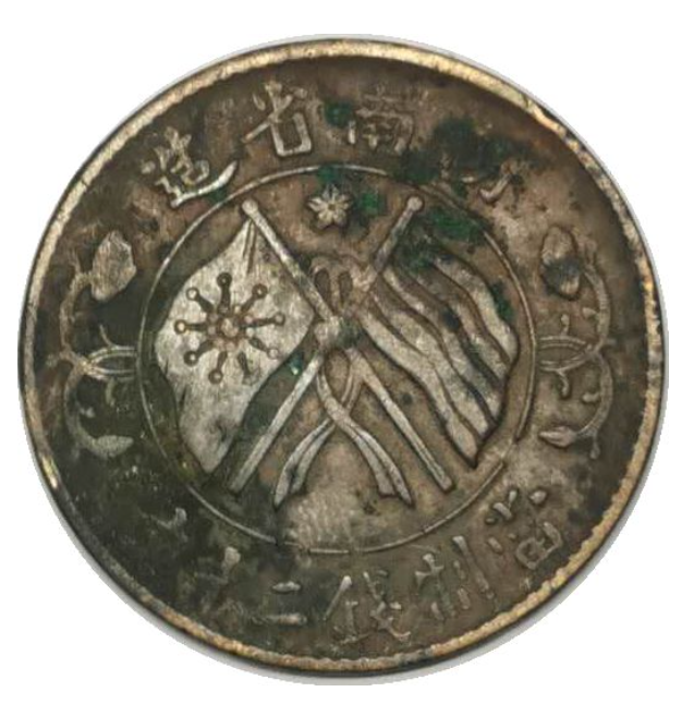 追溯历史根源,这枚双旗币堪称民国初创期的“货币活化石”。1912年辛亥革命胜利后,中华民国成立,新旧政权交替之际,地方财政与金融秩序亟待稳定。时任湖南都督的谭延闿主导了当地货币改革,由长沙造币厂专门铸造这款双旗币,用于替代清代旧币流通。其币面设计极具时代烙印:正面中央交叉矗立的十八星旗与五色旗,分别象征着武昌起义的革命火种与五族共和的政治理念,旗帜纹路清晰,飘带动感十足;上方“湖南省造”四字采用厚重隶书,笔力刚劲,下方“当制钱二十文”标注面值,字体规整,字口深峻。背面则以饱满的嘉禾纹环绕,稻穗与麦穗颗粒清晰,象征“五谷丰登、国泰民安”,暗藏对新生政权的美好期许。藏品出手加微 ADAQ6800.