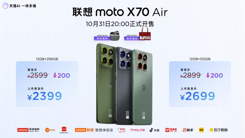 moto X70 Air AI手机目前已全渠道开售,首销价2399元起,叠加国补与平台补贴后性价比突出。同期推出的还有moto razr 60心动赫兹联名礼盒(4399 元)、moto g100 AI 手机(1399 元起)及即将预售的moto g100s AI 手机(999 元起),形成覆盖中高端到入门级的AI产品矩阵。