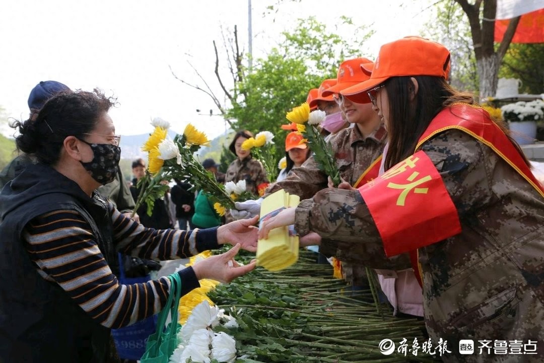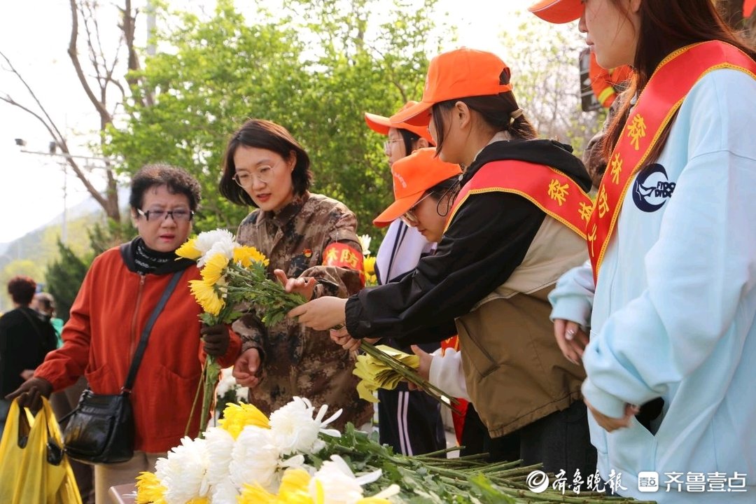 绿色追思情无尽,文明祭扫意更浓。活动现场设立了鲜花兑换点,一束束菊花整齐排列,黄白相间,庄重素雅。济南市林场及驻济高校青年志愿者们身披志愿者绶带,手握宣传单和鲜花,向前来祭扫的市民发放森林防火宣传彩页,普及绿色祭扫理念和森林防火知识,倡导大家把火纸换成鲜花,用绿色、安全、文明的方式进行祭扫。