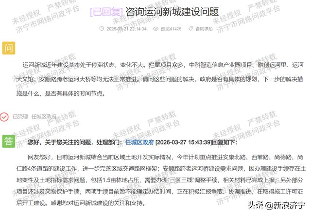 近日,有网友在济宁市网络问政平台就运河新城建设相关问题留言咨询,提及该区域近年建设推进相对平缓,中科智造信息产业园、融创运河里、运河天文馆、安顺路跨老运河大桥等多个项目无法正常推进,询问政府是否有具体规划、下一步解决措施及明确时间节点。对此,任城区政府作出正式回应,明确当前建设工作总体安排及重点项目推进情况。