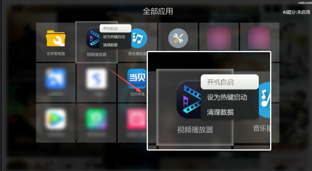 多数播放器开机默认进入主界面(还会猝不及防弹出好多广告),用户需手动选电影或音乐等板块,UHD-K9 8K可在“软件图标”-“轻点三横杆”弹出菜单,直接指定该软件开机后跳转直达或快捷直达: