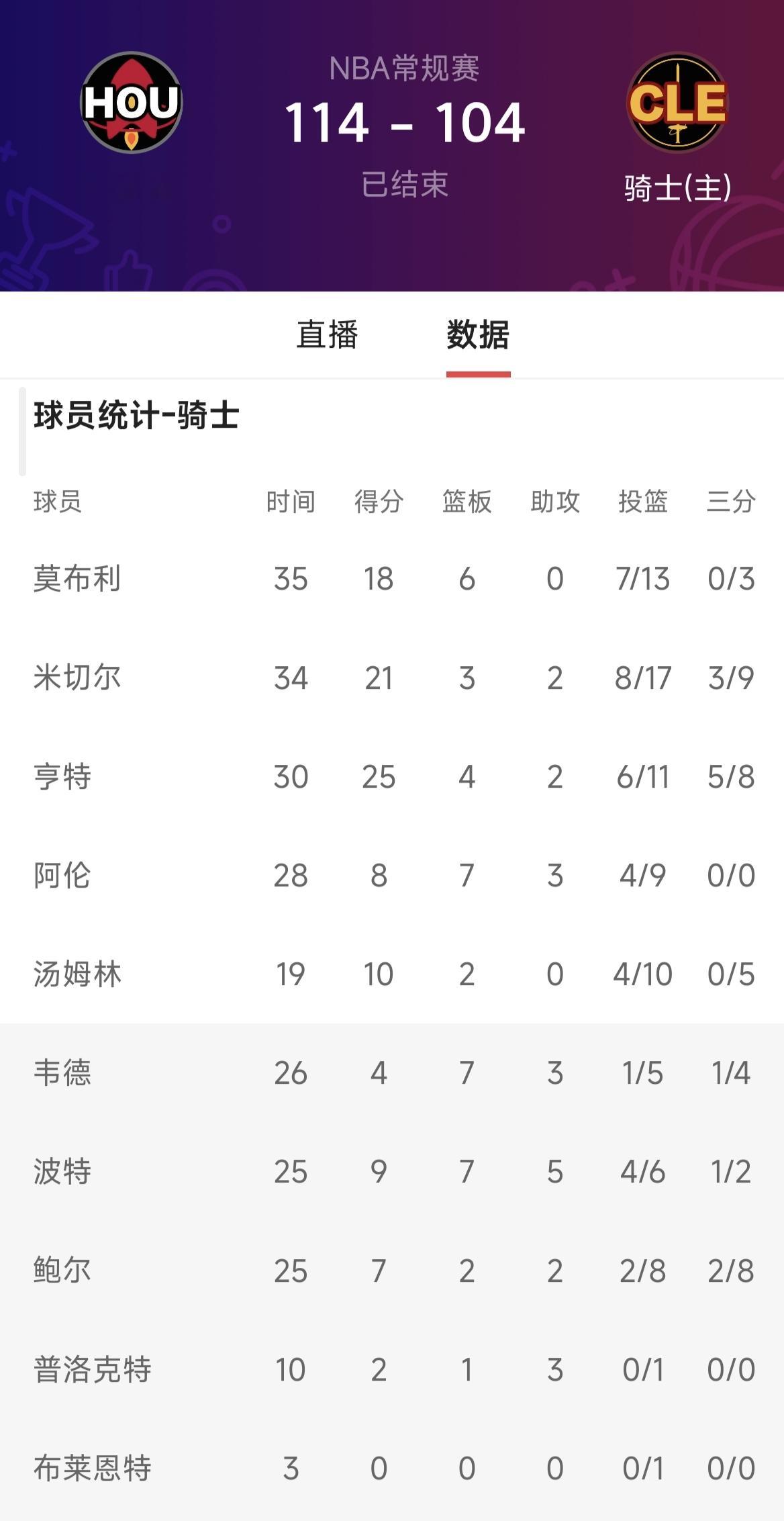 数据层面,火箭展现全面压制:篮板以51-39碾压对手,亚当斯与申京联手抢下22个篮板;罚球环节23罚27中(命中率85.2%),远超骑士20罚32中的62.5%;内线得分52-36的差距,更是申京统治力的直接体现。除申京外,A-霍勒迪替补贡献18分,汤普森拿下12分9篮板6助攻;骑士这边亨特25分、米切尔21分,但球队三分球12投39中(命中率30.8%)的低效表现,成为输球关键。