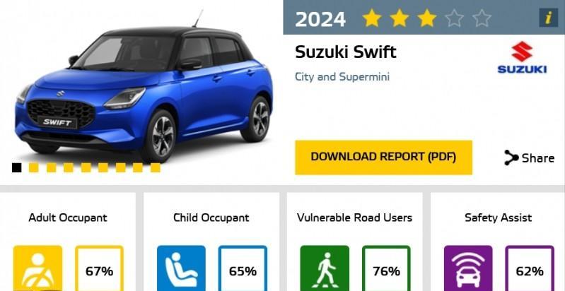据了解,现款第四代铃木Swift在今年早些时候陆续在全球市场推出,新车经过了欧盟NCAP 碰撞测试,总计获得了3星评价。根据欧盟NCAP公布的测试结果显示,欧规版铃木 Swift 在成人乘员保护方面得分为67分,儿童乘员保护方面则为65分。