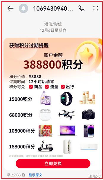风险后果:点击“立即兑换”链接后,可能会跳转到钓鱼网站,要求你输入银行卡、验证码等信息,最终导致银行卡被盗刷;即使是“积分+少量现金”兑换,收到的也会是劣质商品,且无法退款。