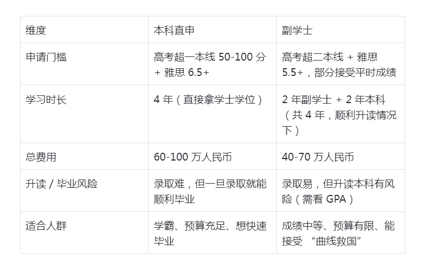 先客观评估自己的高考成绩和语言能力:如果能超一本线 80 分以上,果断冲本科直申;如果只是超二本线,别硬卷,副学士可能更适合;