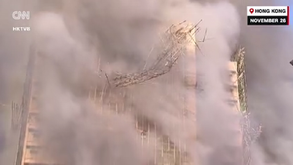 本文作者从CNN播出的现场拍摄的视频中,看到在熊熊燃起的烈焰中,竹制脚手架整片散架地坠落,砸向地面并震耳欲聋的声响。