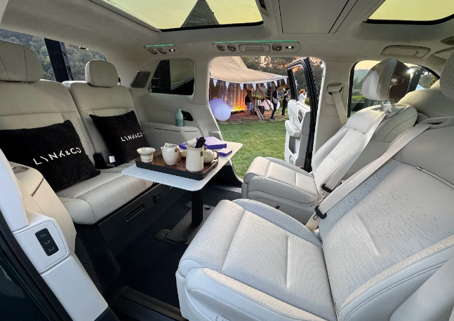 空间方面,领克 900 车长 5240mm,轴距 3160mm,内部空间得房率达 88.2%,为同级最高;内部空间总面积 6.16 平米,人均空间超 1 平米。在座椅布局上,其打破传统 6 座 SUV“前排舒适、后排局促” 的问题,实现各排座椅舒适性均衡。车内配备双 180 度电动旋转座椅,二排座椅向后旋转 180 度后,与三排座椅形成面对面布局,中间间距达 1.7 米,可作为 “移动会客厅” 或 “移动工作室”;二排座椅向外旋转 90 度时,便于老人上下车和儿童座椅安装,提升家庭用户用车便利性。