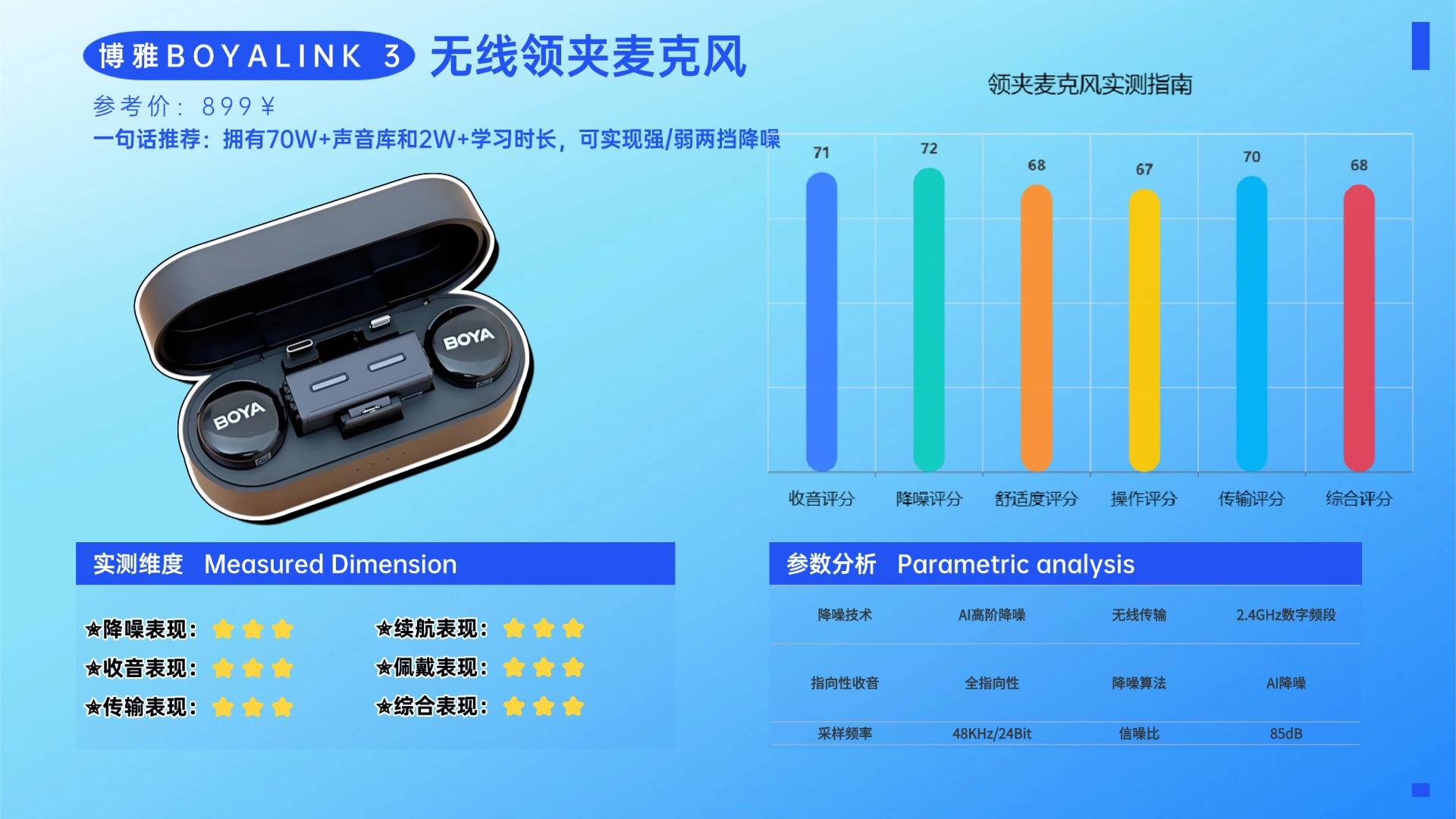 整体来看,BOYALINK 3兼具轻便性、多设备兼容性、长续航与AI降噪功能,适合Vlog创作者、直播主播及小型工作室使用。虽在极端风噪环境下略显不足,但其性价比与多机位同步优势仍然突出,是日常拍摄与多平台直播的实用选择。