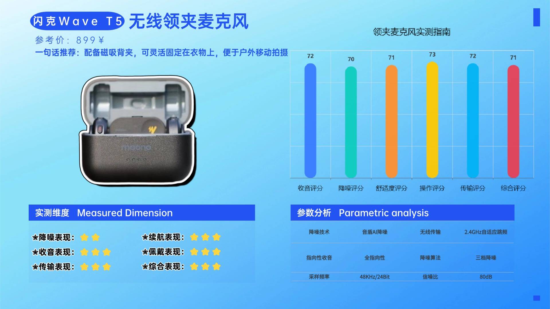 总的来说,闪克 Wave T5兼具轻量化、灵活固定、稳定收音和远距离传输能力,是视频创作者、Vlogger及户外拍摄用户的实用选择。虽在极端环境下略显不足,但其高性价比和全面功能仍足以满足大多数拍摄场景需求。