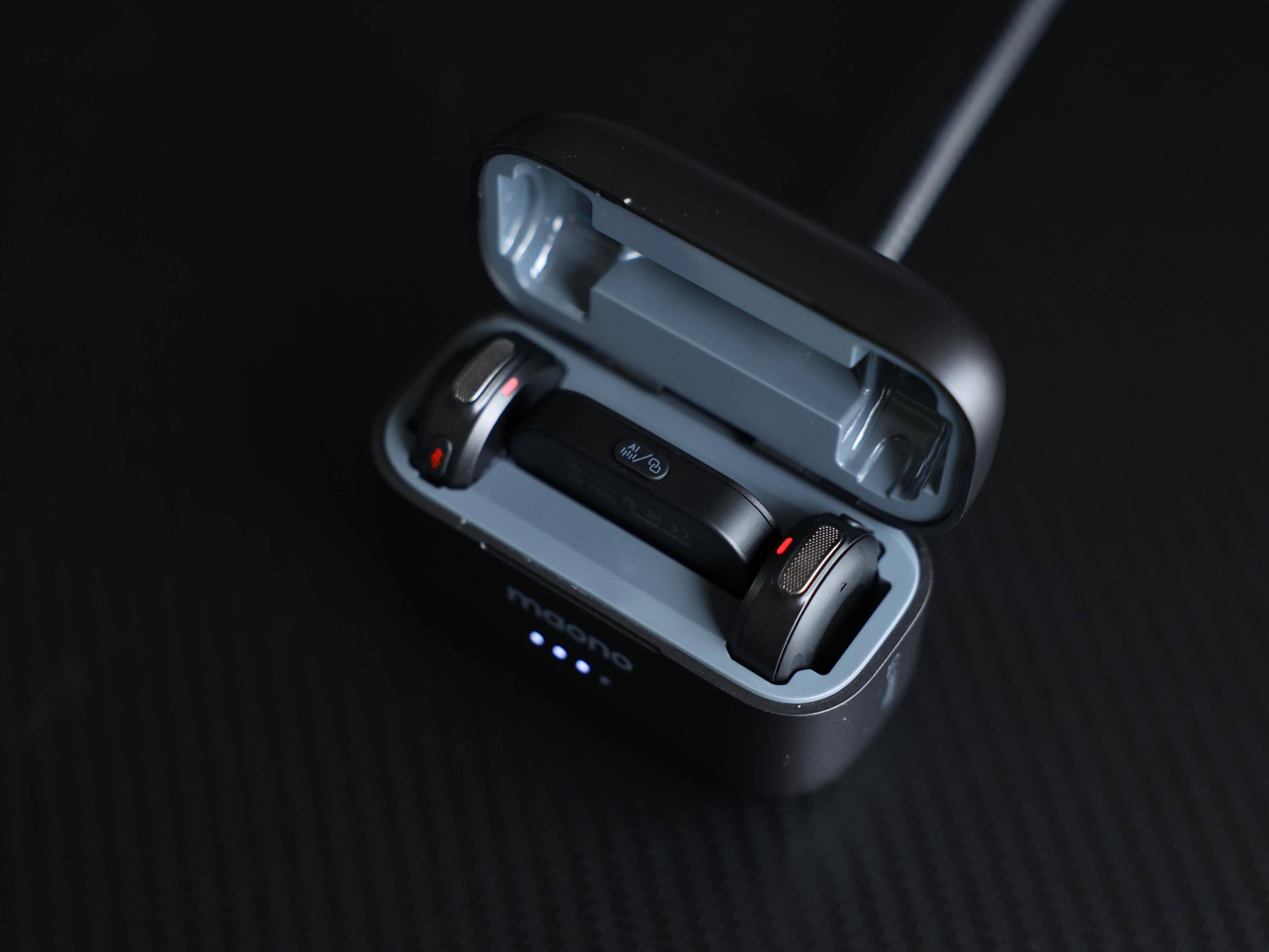 M1的设计简洁,内置LED状态指示灯与一键静音功能让操作直观易懂,即使是没有专业设备经验的用户也能轻松上手。其配套的充电盒可以同时为发射器和接收器充电,便于携带和存放,续航方面也很不错,发射器和接收器的组合续航可达20小时,非常适合长时间录制和直播使用。即便在不同的拍摄环境下,M1的音质表现也能保持相对稳定。