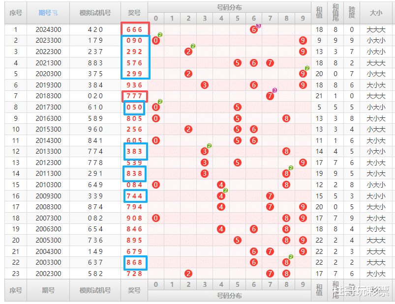 数字"0"和"8"的绝对统治:这两个数字在历年300期中表现极其抢眼,尤其在个位和十位形成稳定出号模式