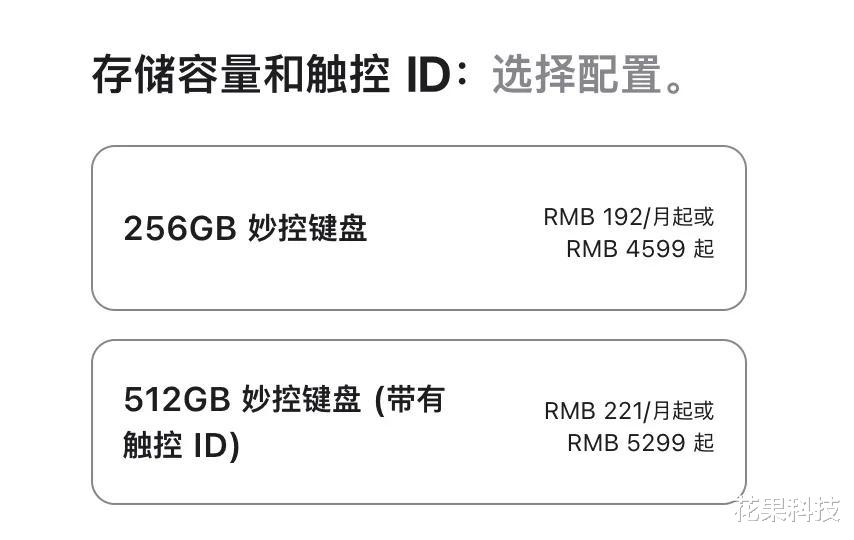 可以选择 256GB 和 512GB 硬盘容量,并且值得注意的是,只有 512GB 版本使用了触控 ID,256GB 版本是没有触控 ID 的。