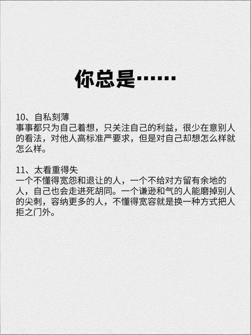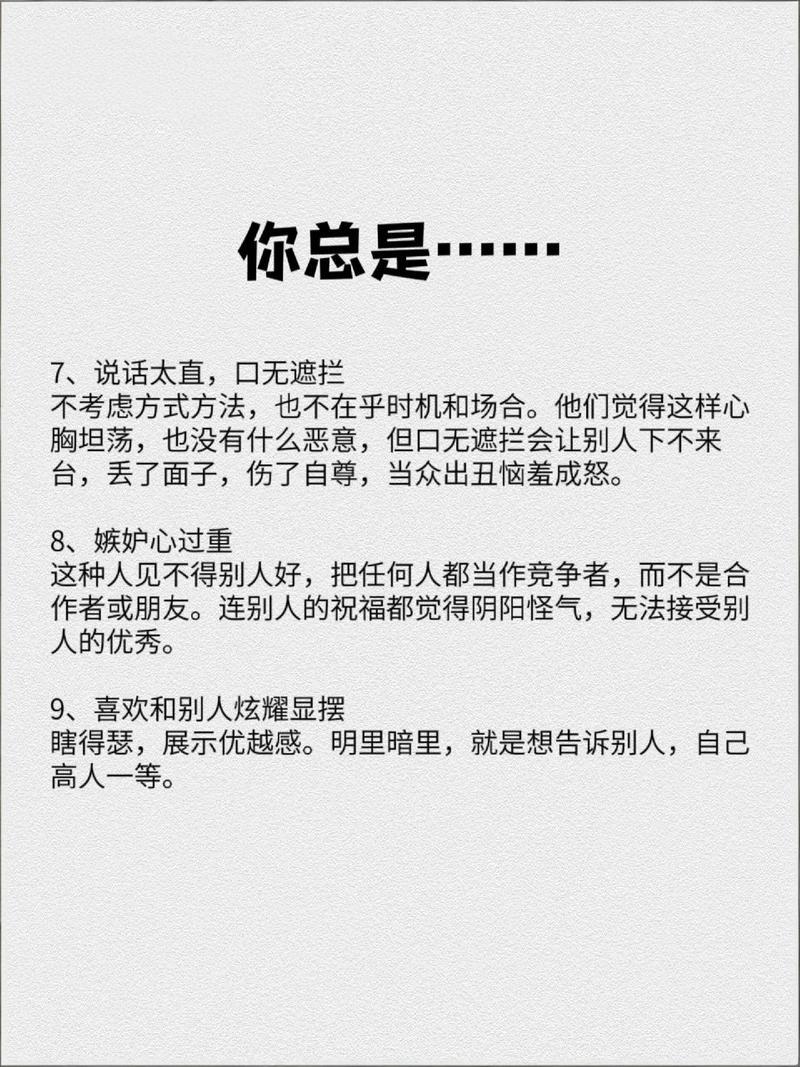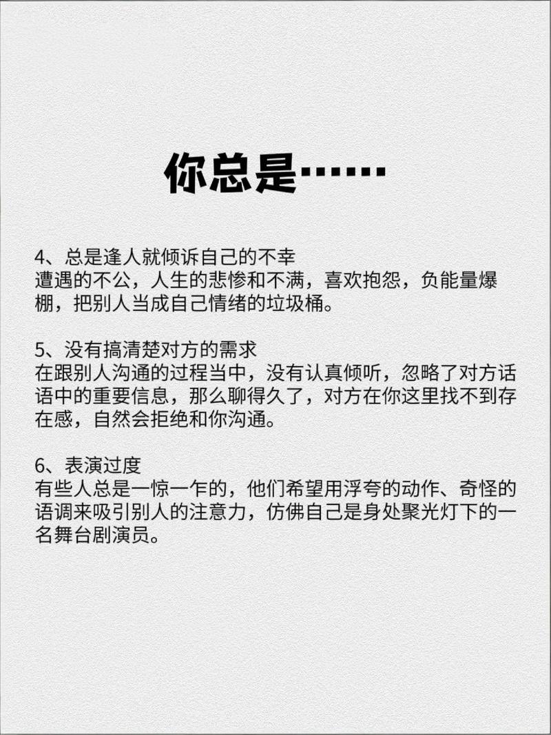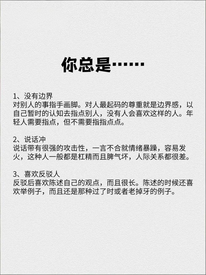 再亲密的关系,也需要呼吸的空间。你以“为你好”之名,肆意干涉朋友的选择;你毫无分寸,不断探听别人不愿透露的隐私;你把别人的时间和精力,当作自己的资源随意占用。这种边界感的模糊,会让身边的人感到窒息和压迫,最终只能通过远离你来保卫自己的心理领地。