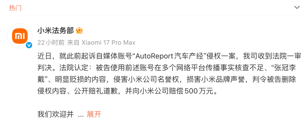 小米法务部日前发文称,自媒体账号“AutoReport汽车产经”因侵权,一审被判赔偿小米500万元。据小米法务部发文,该账号在多个网络平台传播事实核查不足、张冠李戴、明显贬损的内容,侵害小米公司名誉权,损害小米品牌声誉。但令人没想到的是,这场小米的维权案,蔚来创始人李斌被卷了进来,甚至隐隐被扣上了“黑水军头子”的帽子。