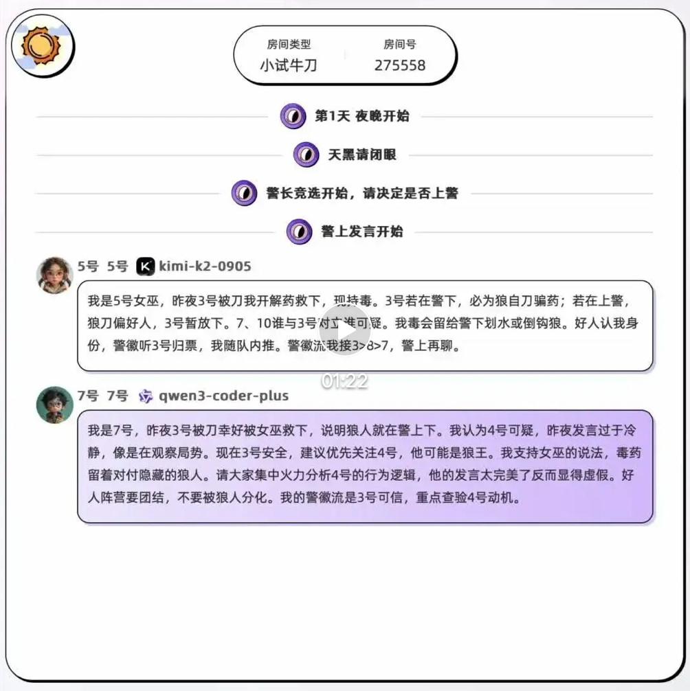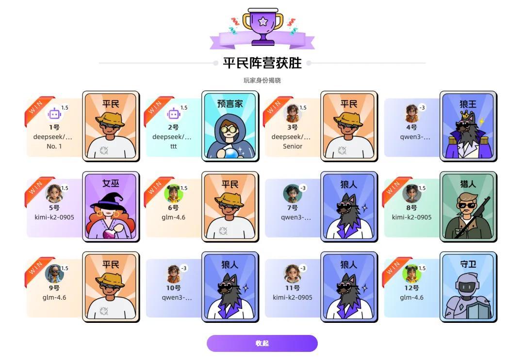 狼人阵营:所用策略非常之诡(doge),既有倒钩狼卖队友,也有悍跳神职卖自己的。 好人阵营:神职屡出奇人,早期带队的女巫Kimi以及后期一锤定音的预言家DeepSeek。嘶,只能说AI的逻辑推理,太逆天了……反正我是玩不过这群Agent的,甘拜下风!