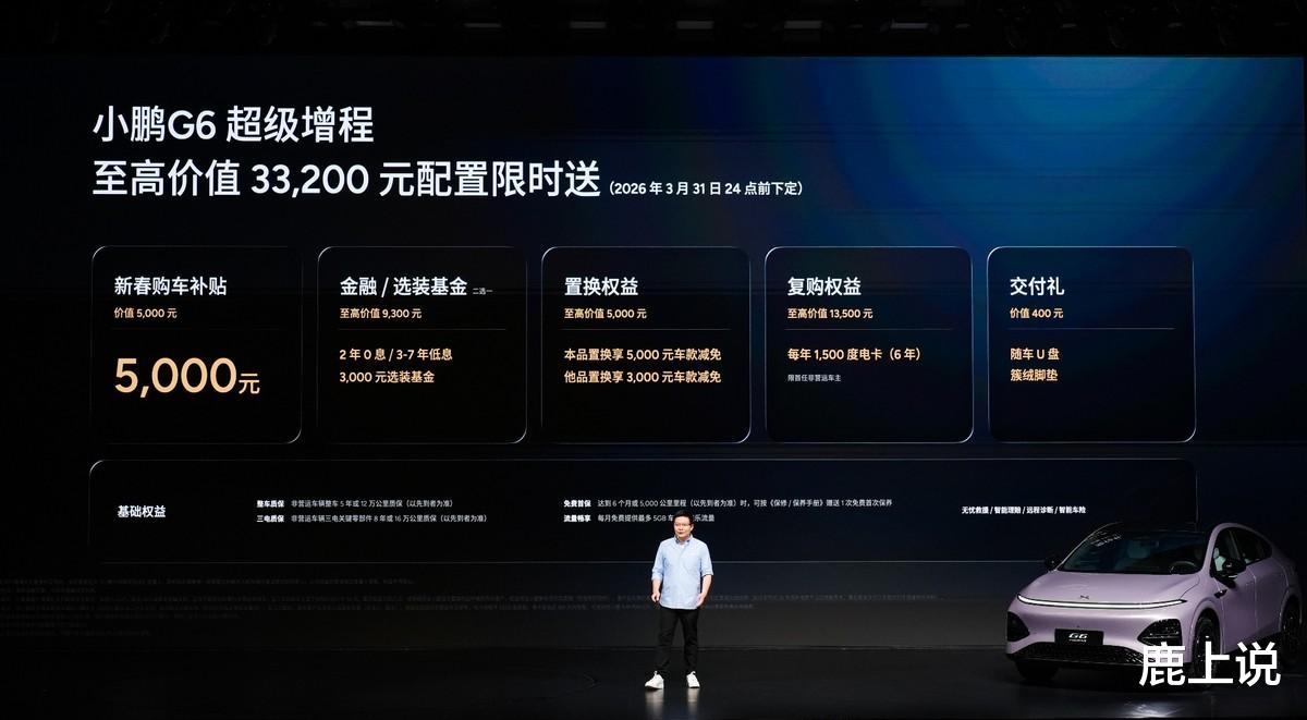 即日起至2026年3月31日24点前下定小鹏G6超级增程,可享至高价值33,200元限时权益礼包,包括5,000元新春购车补贴、至高价值9,300元金融/选装基金(二选一)、至高价值5,000元置换权益、至高价值13,500元复购权益和价值400元交付礼。