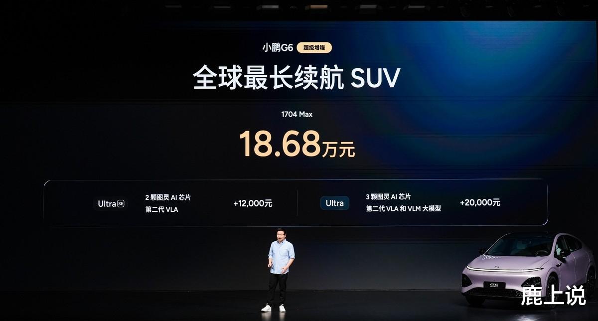 本次发布小鹏G6超级增程1704 Max,官方指导价为18.68万元,用户可选装两个智能升级包,加购12,000元升级为Ultra SE版本、加购20,000元升级为Ultra版本。