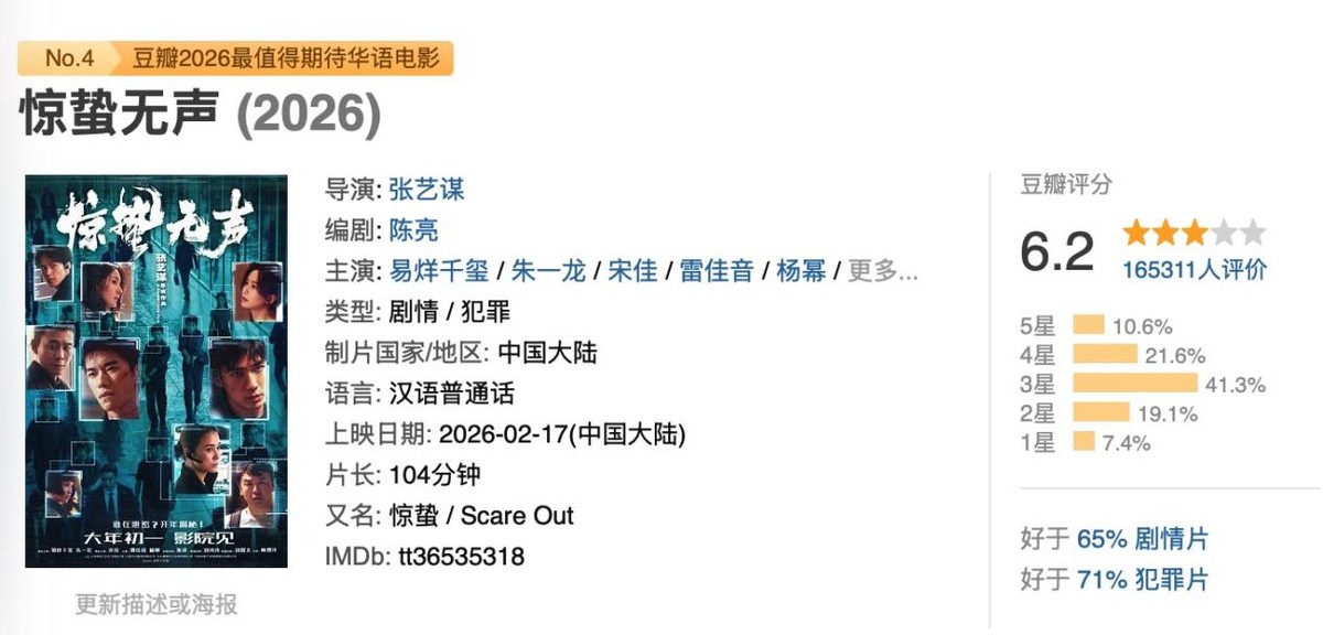 《惊蛰无声》上映之后,口碑几乎呈现直线下坠的趋势,最终稳稳落在春节档所有影片的评分末端,成为本届最让人失望的作品之一。