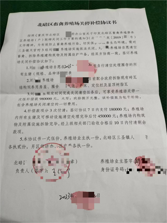 2023年1月,刘先生与三圣镇行政单位签订《北碚区畜禽养殖场关停补偿协议书》,约定给予一次性补偿98万元。但该协议在签订与执行过程中,刘先生质疑存在多处争议: