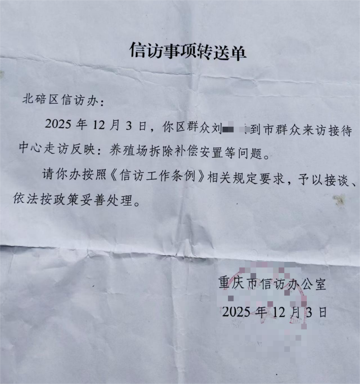 一份无公章、无附表、附表未签字的关停补偿协议,让依法创业十余年的养殖户陷入绝境;环评齐全、粪水全量还田合规处置,却被罚款5万元;投入46万成本无归,配合工作遭意外致残……市北碚区三圣镇养殖户刘先生多年权益维护之路举步维艰,相关诉求仍待回复。