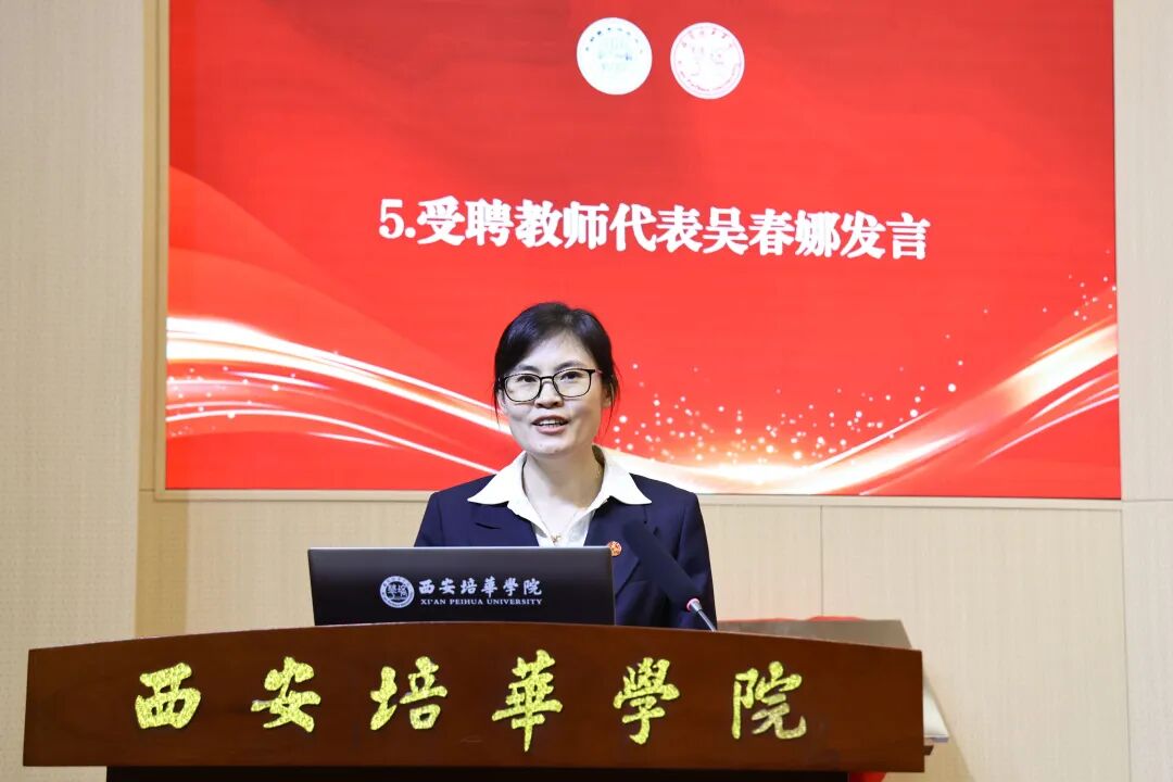 受聘教师代表吴春娜教授发言,她代表全体受聘教师,向学校的培养信任、苏州大学民办教育研究中心的关怀支持表示感谢。她表示,西部基地的揭牌为一线教师搭建了宝贵的学习交流平台,全体受聘教师将珍惜平台、虚心学习,立足实践、扎实研究,履职尽责、协同共进,以务实作风产出高质量研究成果,服务学校高质量发展与西部民办教育事业进步。