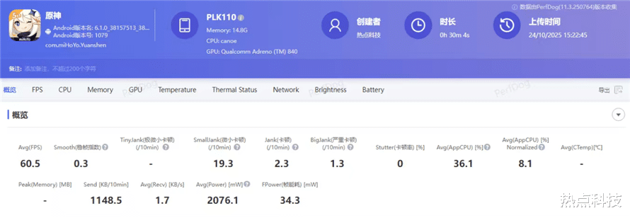 在《原神》游戏中,一加15可以通过插帧的方式实现120Hz,并且提供了更高分辨率可以选择。我们测试了原生60Hz模式,但是将分辨率提升到2772*1272,跑图整整半小时,最终测试游戏平均帧率为60.5fps,游戏平均功耗为4.1W。