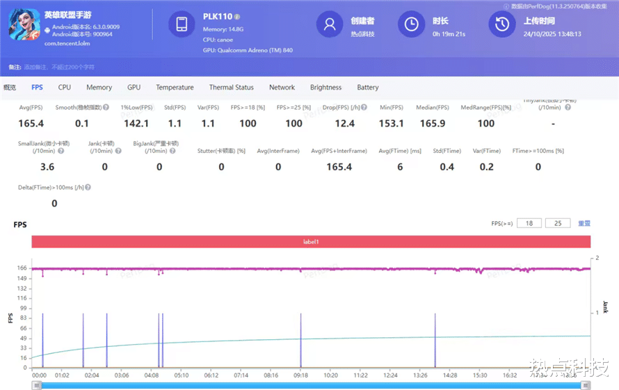 我们测试《英雄联盟手游》,高画面品质,165帧率模式,测得游戏的平均帧率为165.4fps,游戏平均功耗为3.8W,游戏全程没有明显卡顿现象,非常流畅。