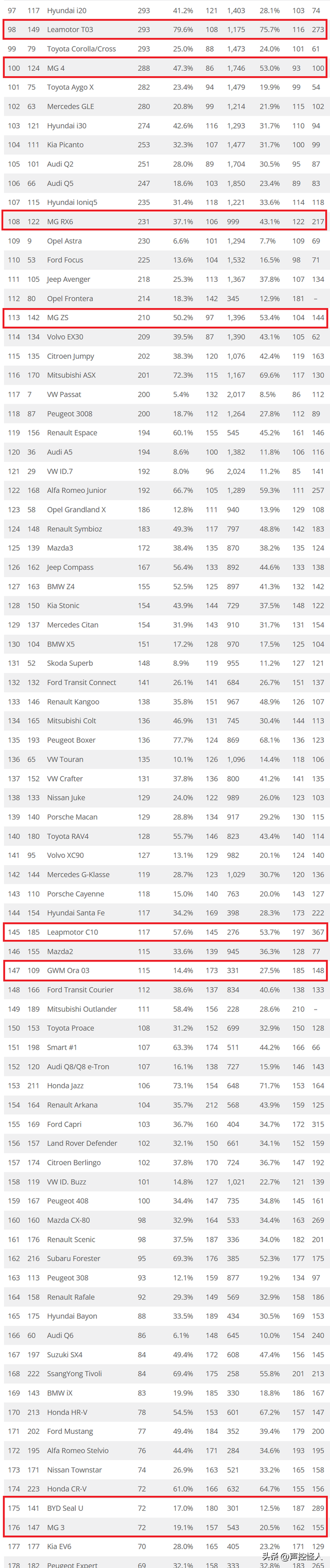 最畅销的中国车型为零跑的T03,一共销售了293辆,排名98.在前100名中还有一款中国车型,那就是MG4,销量为124,刚好排在100.最畅销的比亚迪车型为海豹U,一共销售了72辆,排名175,比5月份的180名有所上升。