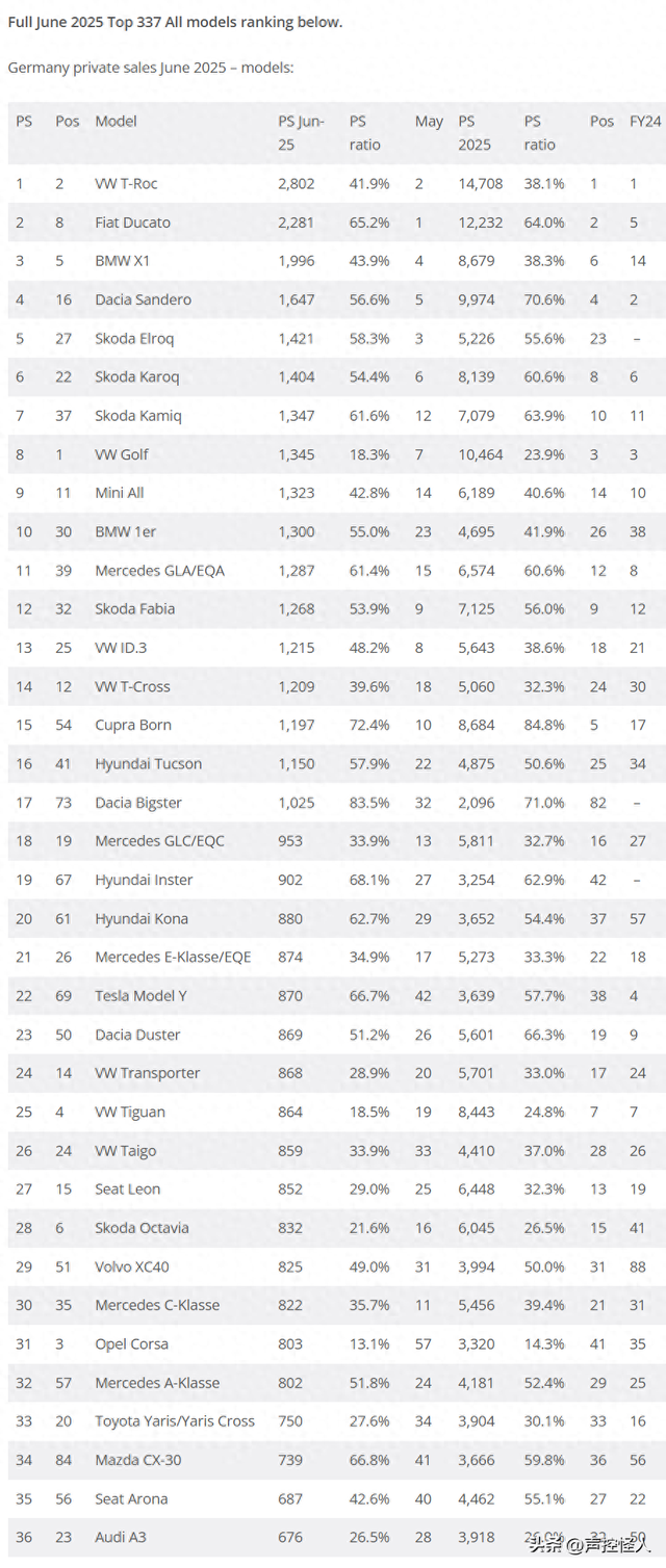 6月份,德国私人客户购买了84544辆新车,同比下降10.3%。私人销售占比为33%(PSR),而2024年6月为31.7%。在前36名中,无一款中国车型,而特斯拉MODEL Y以870辆的成绩排名22,成绩不算太差。