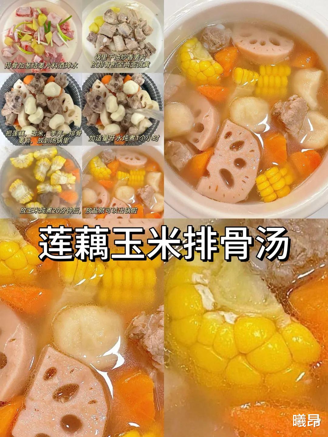 食材:排骨 500g、莲藕 1 节、玉米 1 根、姜片 3 片、盐 1 勺