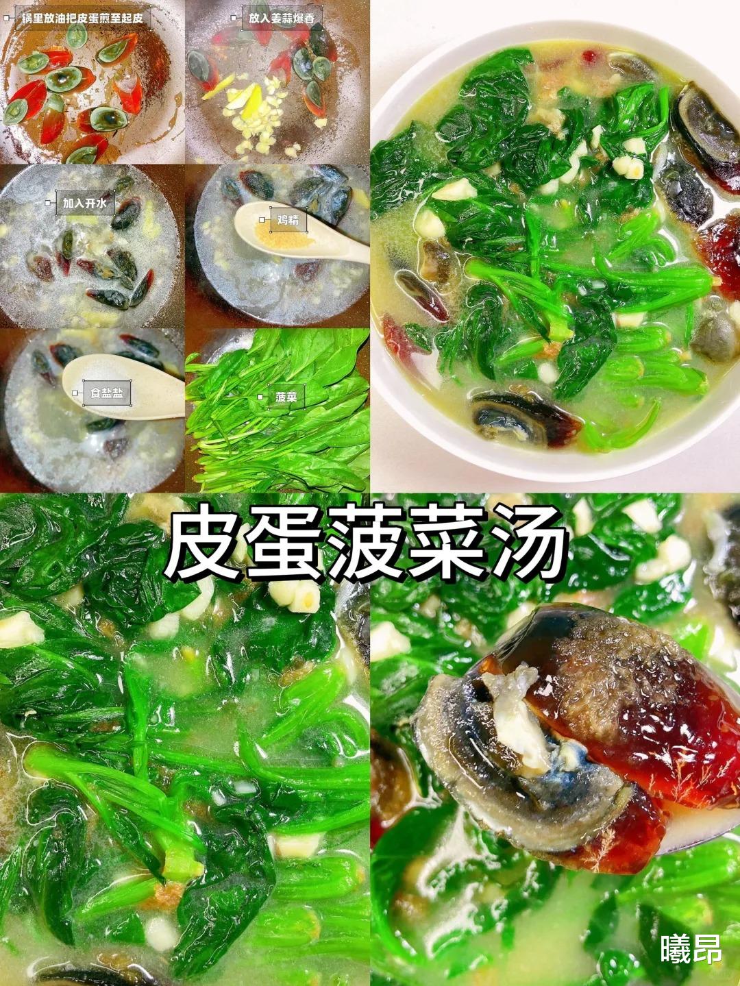 食材:皮蛋 1 个、菠菜 200g、姜片 2 片、盐半勺