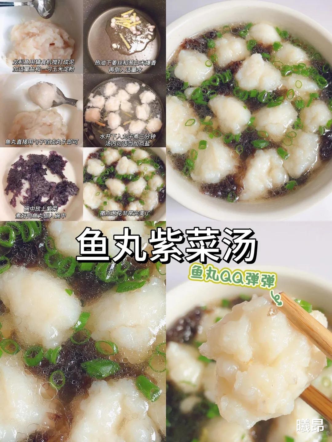 食材:鱼丸 8 颗、干紫菜 10g、虾皮 5g、葱花少许、盐半勺