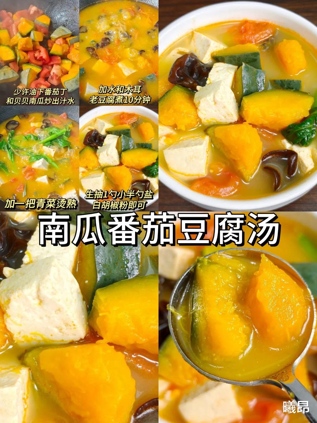 食材:南瓜 200g、番茄 2 个、嫩豆腐 150g、盐半勺、葱花少许