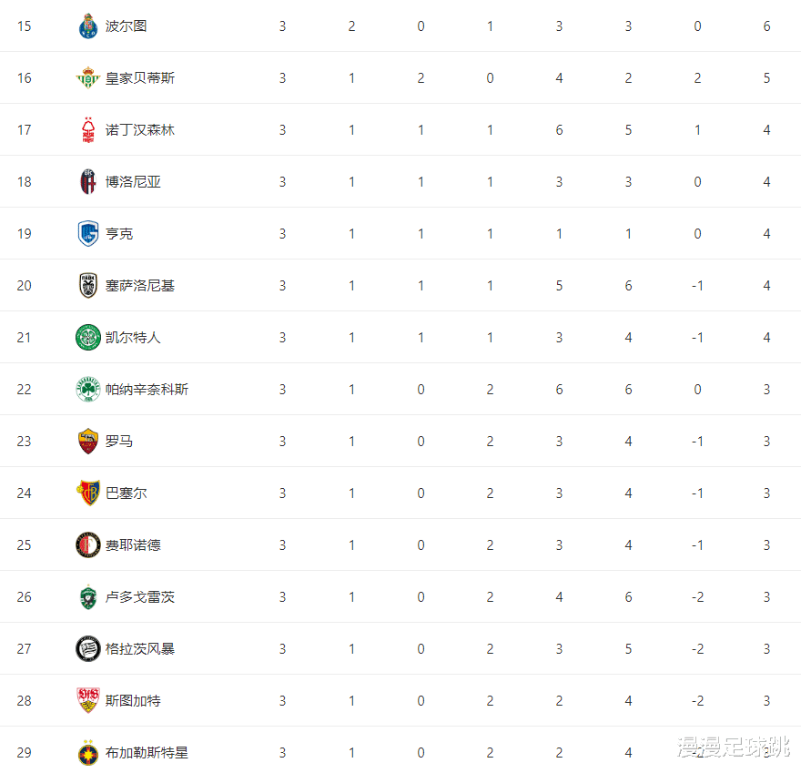 北京时间10月24号凌晨,欧联杯战火重燃,多支五大联赛劲旅悉数登场,结果多支英超球队大爆冷门,仅存诺丁汉森林新帅戴奇首秀开门红,维拉被逆转1-2输给前进之鹰,水晶宫0-1不敌AEK拉纳卡,诺丁汉森林2-0波尔图,罗马1-2不敌比尔森胜利,皇家贝蒂斯0-0比甲球队亨克,欧联积分榜乱成一锅粥。