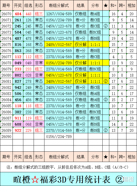 26090期:暄橙福彩3D综合条件(本期将在4月10日21:15开)一、上期回顾 ☆1、上期开奖号:9 2 2。2、和值= 13,跨度= 7。3、组三形态,022路组合。4、热度分布(热:温:冷)0:3:0。二、本期条件 ☆1、三期缺码:3457。2、热:1268,温:059,冷:347。3、断组分解式:0156//234-789。4、四胆:3589;三胆:358。三、术语解释 ☆1、三期缺码:0至9这十个自然数当中,未在近三期开奖号出现的数字。2、热度(热温冷):自然数0至9,在近七期开奖号中,出现3次及3次以上的数字,称为热码;出现2次的数字,称为温码;出现1次和未出现的数字,称为冷码。某个数字在开奖号中出现几个,就按几次计算。3、断组分解式:将0至9这十个自然数,分成三组数字,从前往后依次为A组(4码)、B组(3码)、C组(3码),一般情况下,有一组数字不出码,偶尔会有两组数字不出码。A组不出码的情况相对较少。断组为主,分解为辅。4、常态组六号码:同时包含大数、小数、奇数、偶数、质数、合数的组六号码,共有72注。统计表中,简称“常态”。5、非常态组六号码:全大数、全小数、全奇数、全偶数、全质数、全合数等六种形态的组六号码,共有48注。统计表中,简称“非常”。★提醒:彩市有风险,参与须谨慎!水平有限,仅供参考!