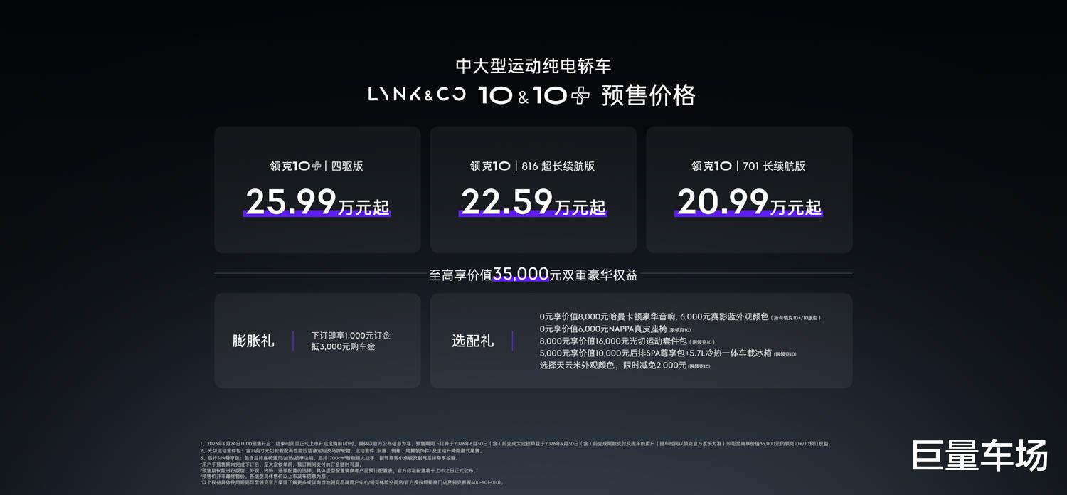 本届车展,备受期待的中大型运动纯电轿车——领克10+和10正式开启预售,共推出三个版型:领克10的701长续航版预售价20.99万元起,816超长续航版预售价22.59万元起;领克10+四驱版预售价为25.99万元起。预售期间下订可至高享价值35,000元双重豪华权益。此外,还可选装“弯道之王”加强件 Racing Package,价格为69,900元。领克10+和10将于今年5月正式上市。