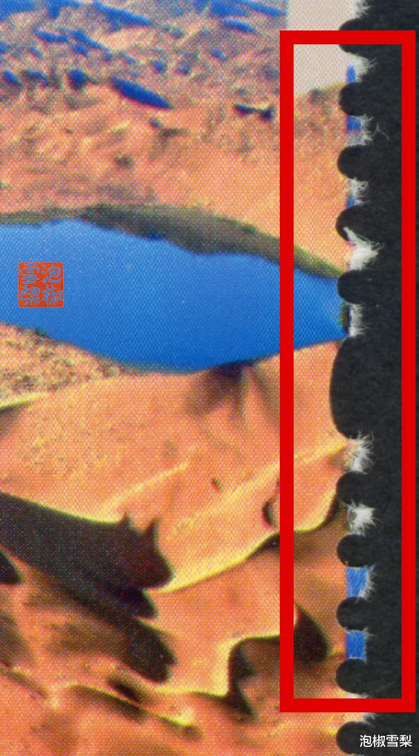 答案也许就在普通邮票《美丽中国》上,如果齿孔和邮票画面边界不够精准,那么邮票撕开后就会在齿孔附近留下其它邮票的颜色,造成画面割离。
