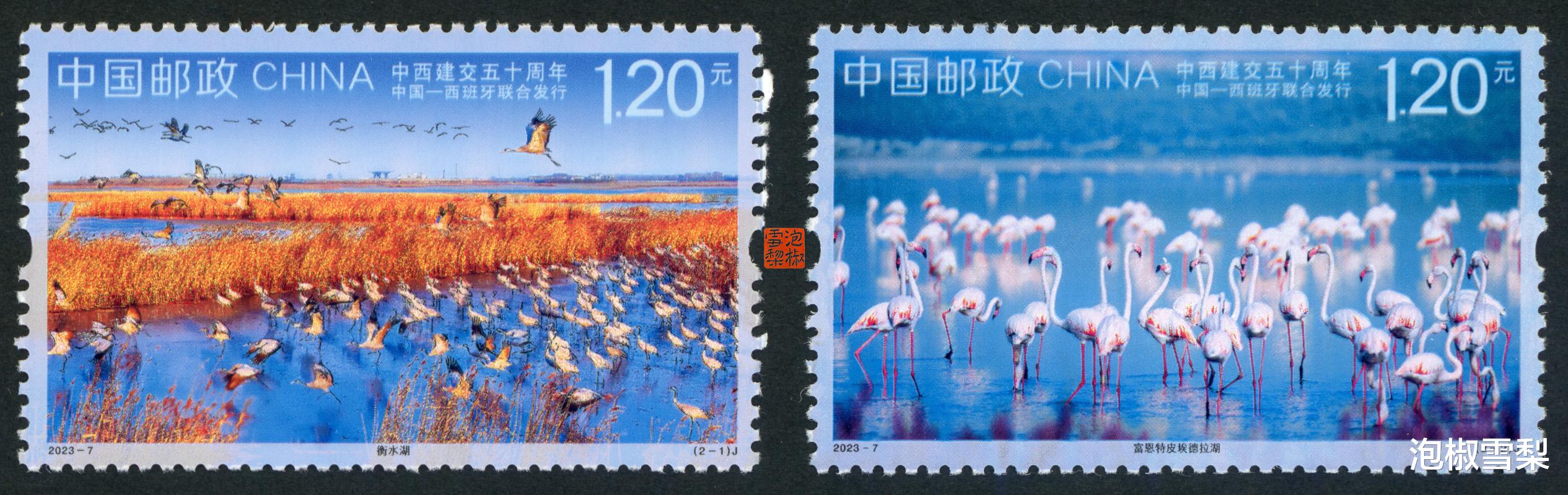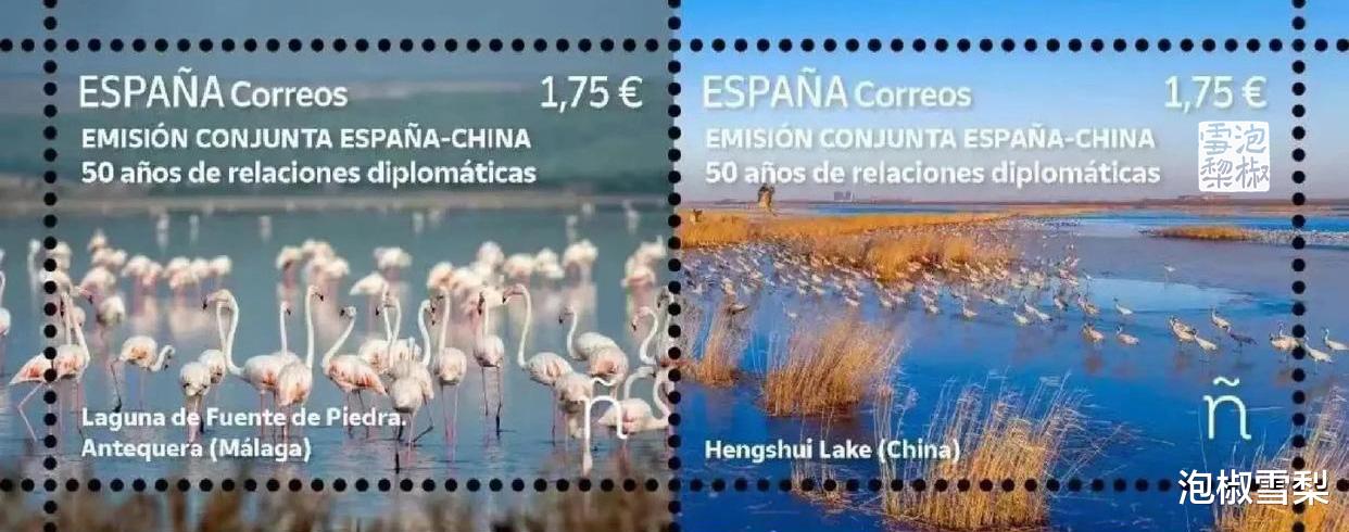 少了边框的约束,画面会显得更加简洁干净,比如这套2023年中国与西班牙联合发行的邮票,同样的画面放到两国不同的设计上,给人的视觉感受是完全不同的,这就是边框所带来的影响。
