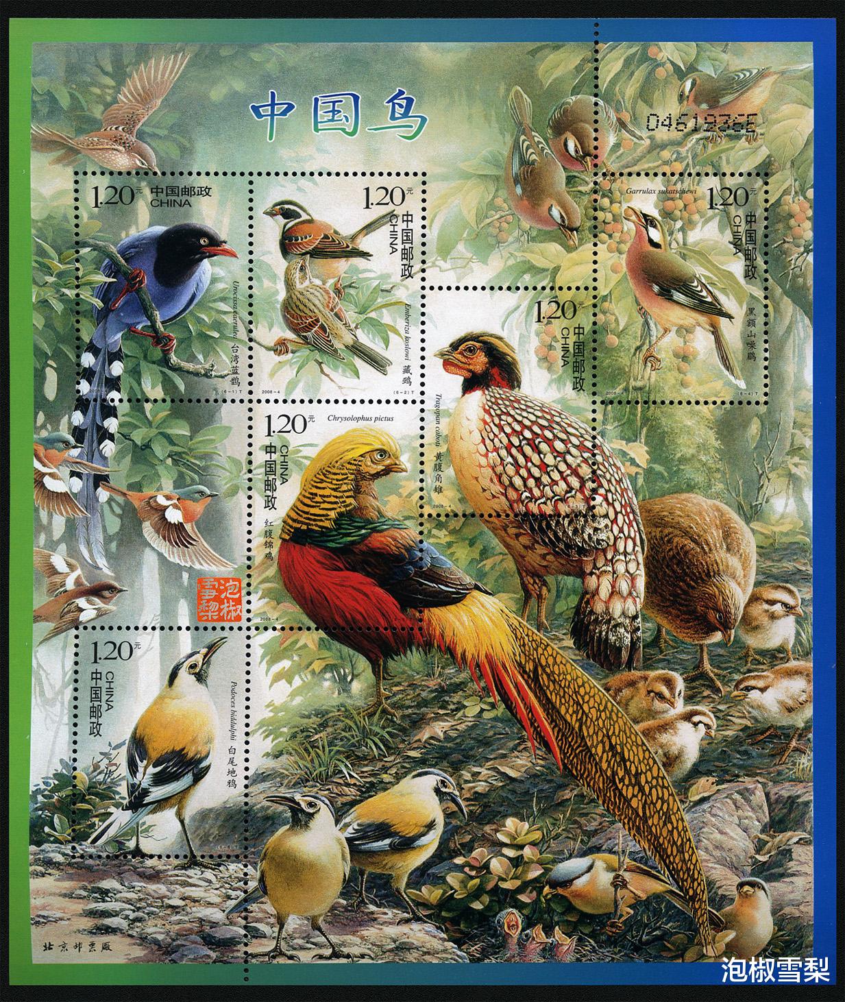 而当年的另一套邮票《中国鸟》,本来已经消灭了每枚邮票的独立边框,却又在套版的边纸上加了一圈大边框,成了这套邮票最大的减分项。
