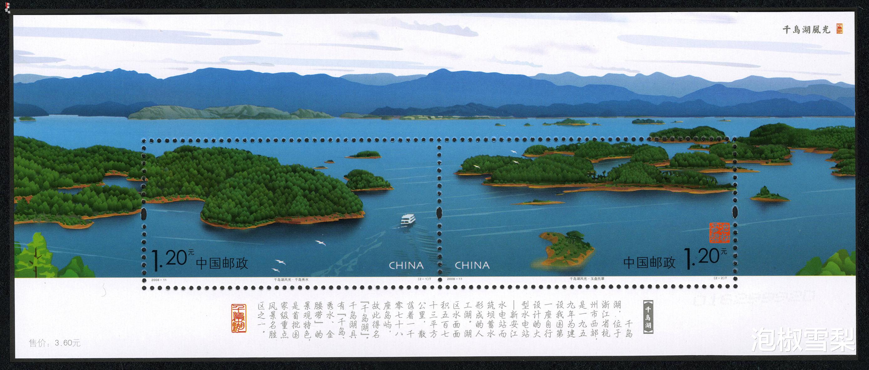 还有个办法就是印成套票版张或小全张,像是2008年的《千岛湖风光》,就能很好的消灭边框带来的视觉约束。