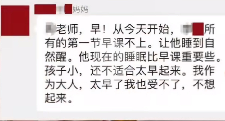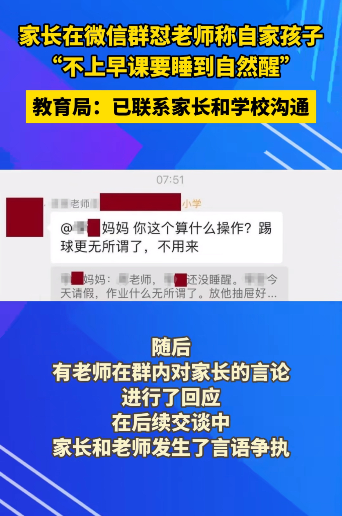 聊天记录里称:她的小孩以后每天第一节早课不上了,让小孩睡到自然醒,她的小孩睡眠比早课重要。随后就有老师在群里回应到:让她有什么想法和建议私聊,不要在群里说,避免影响到其他人。但是在后续的交谈里,这名家长和老师却发生了言语上的争执,上海市金山区教育局的工作人员称:目前已经联系了家长和学校,正在沟通调解。