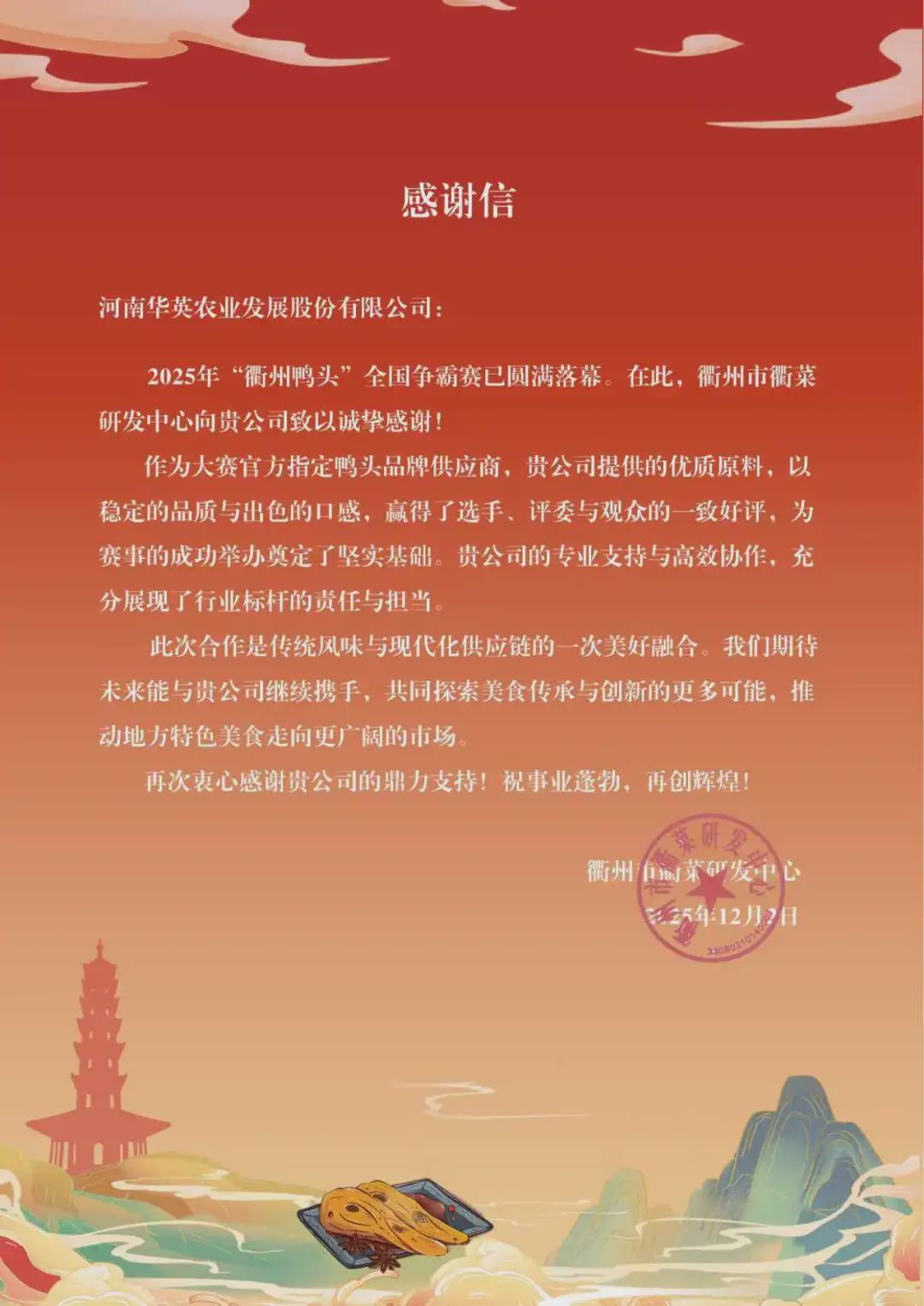 活动取得圆满成功,进一步擦亮衢州鸭头这张“生态美食名片”。衢州市衢菜研发中心感谢信中对华英农业表示诚挚谢意,作为大赛官方指定鸭头品牌供应商,华英公司提供的优质原料,以稳定的品质与出色的口感,赢得了选手、评委与观众的一致好评,为赛事的成功举办奠定了坚实基础。华英公司的专业支持与高效协作,充分展现了行业标杆的责任与担当。